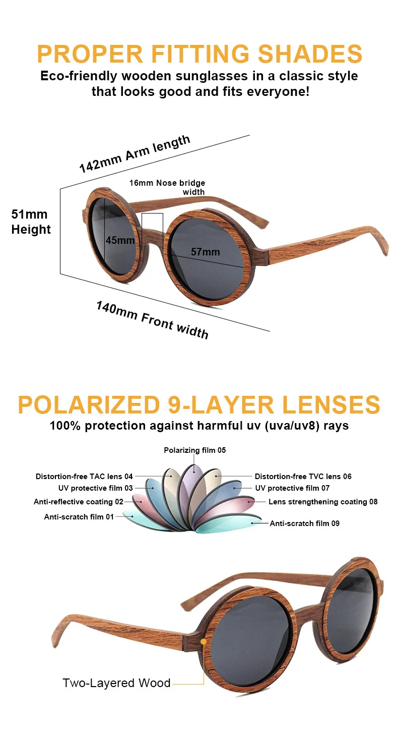 The sunglasses is a highly unique and individual design. This striking round wooden frames is double layered with Burl wood and Ebony. Thus making this frame very sought after.